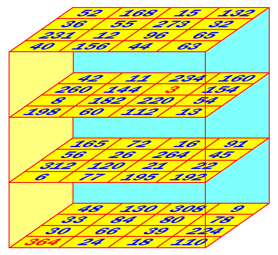 Il n'y a pas que les carrés qui sont magiques, les cubes peuvent tout à fait l'être aussi ! Il faut pour cela que la somme sur les n² lignes, n² colonnes, n² piles et 4 triagonales du cube soit constante. Quand on demande à ce que les 6n diagonales donnent également la constante magique, on parle de cube magique parfait. Les cubes magiques parfaits d'ordre 3 et 4 ont été démontrés impossibles, et des cubes d'ordre 5 et 6 ont été publiés en 2003 (Boyer & Trump) : le problème des plus petits cubes parfaits n'est plus vraiment à l'ordre du jour.
